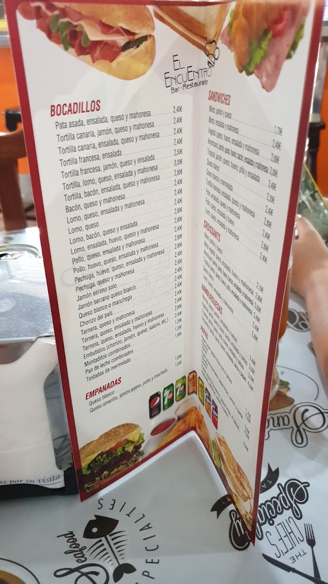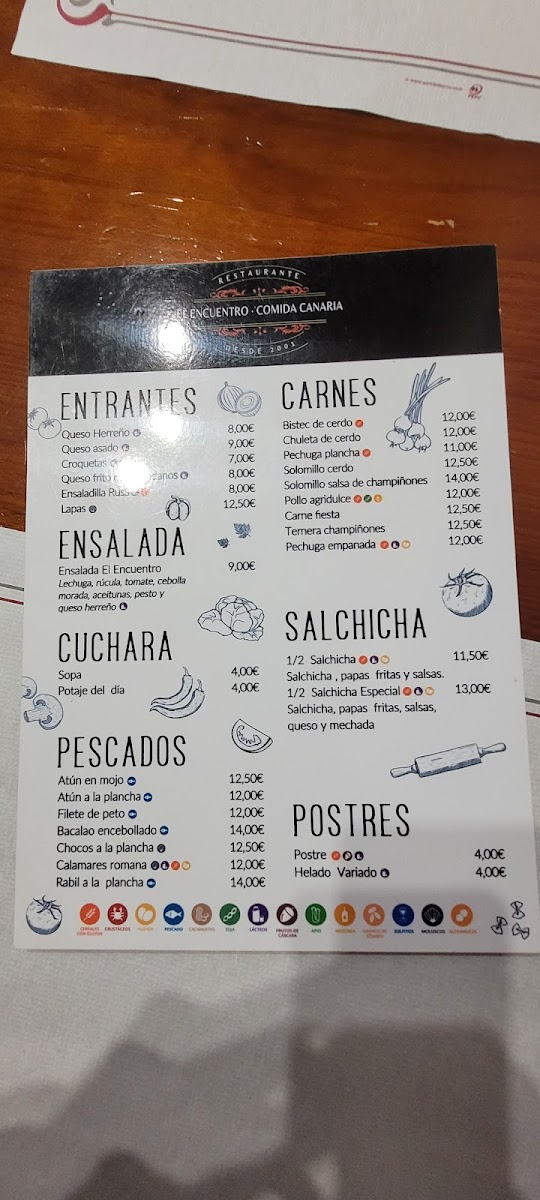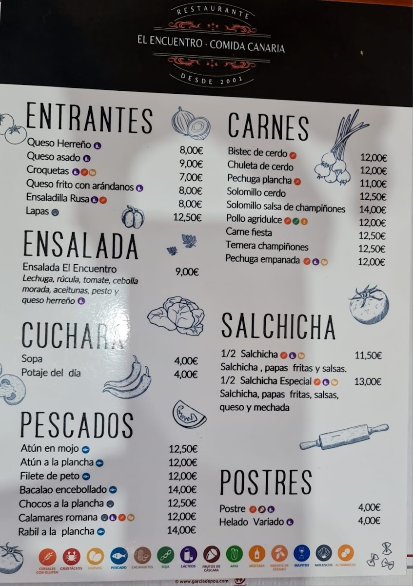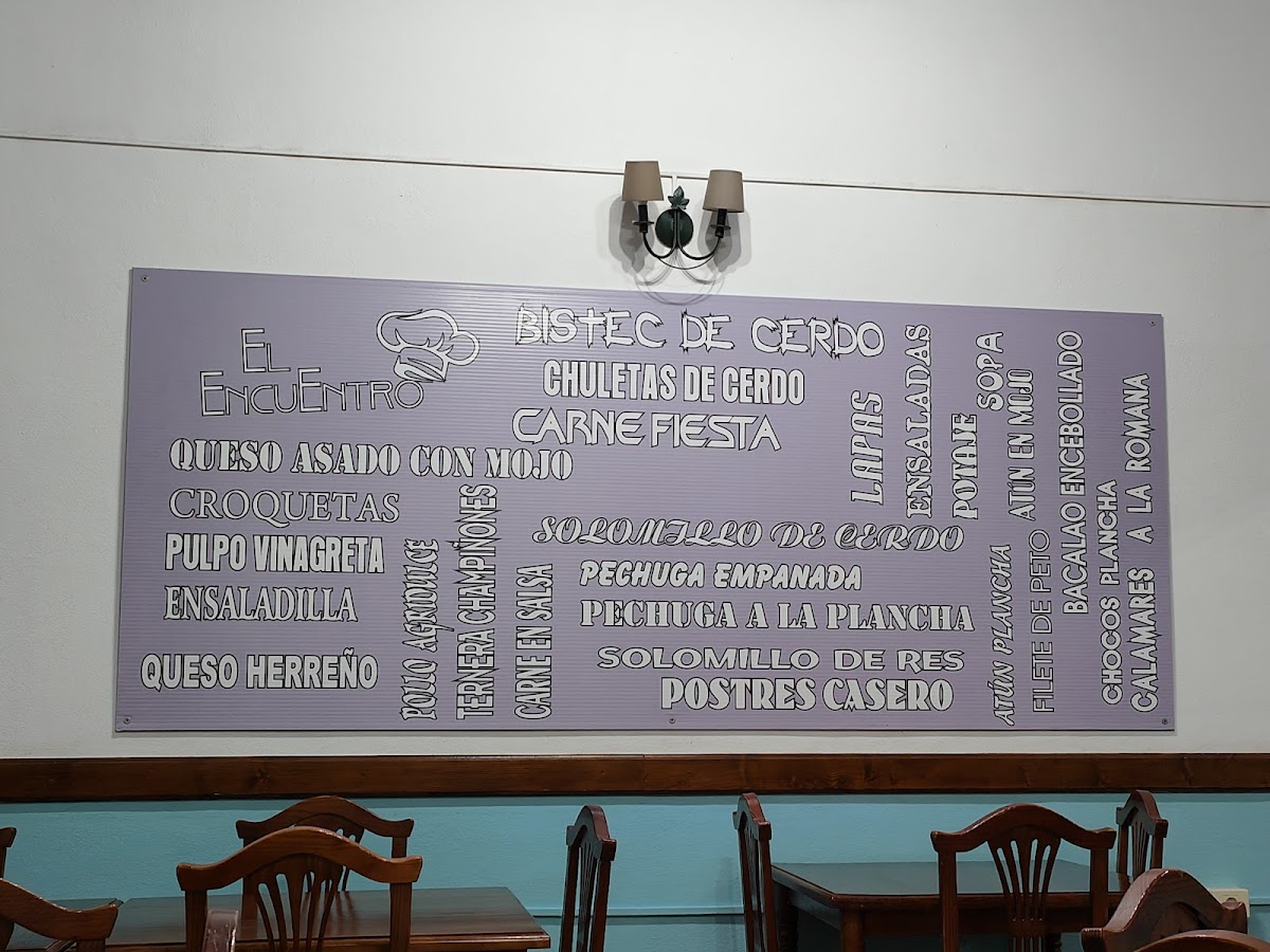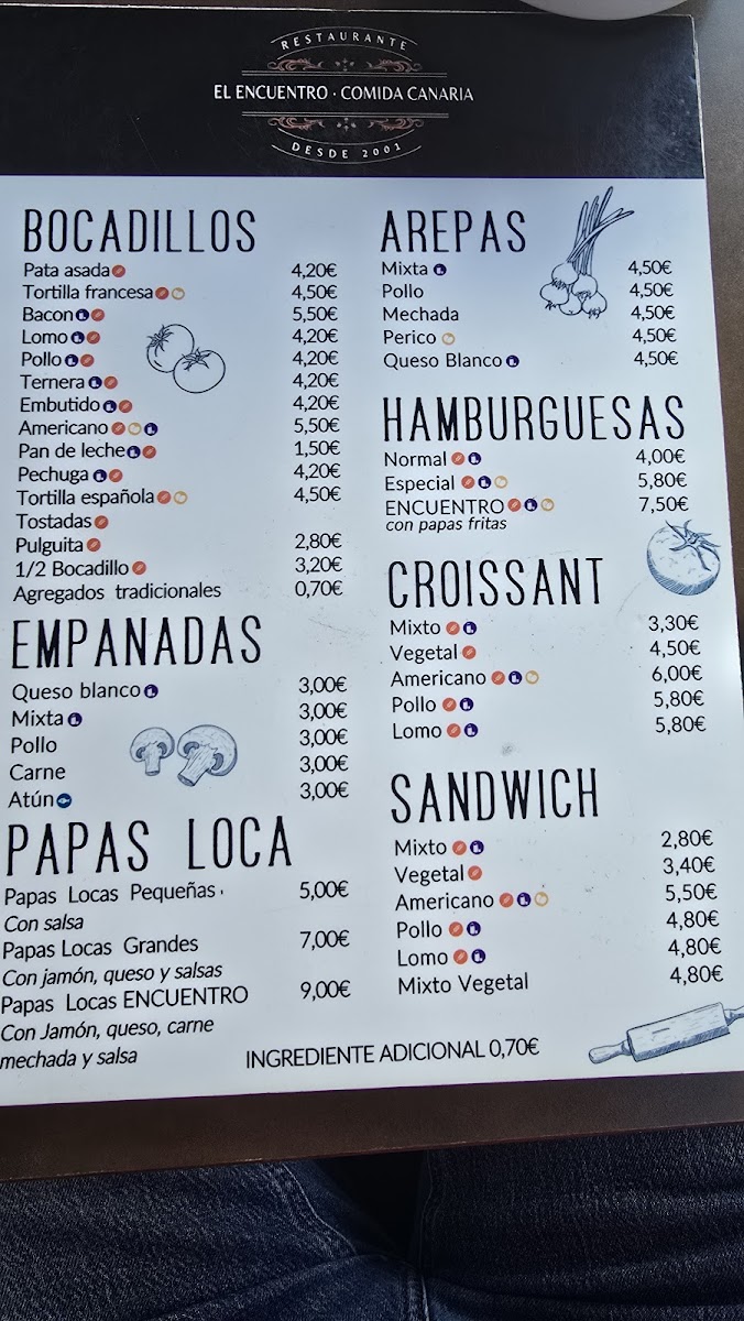 Diverse accompaniments and traditional stews such as garbanzas and potaje are part of the offerings, alongside popular snacks like croquetas caseras and papas locas. The menu includes typical local items such as arepas and quesillo. For dessert, choices like tarta de frutas, mousse de limón, and mus de plátano are presented.